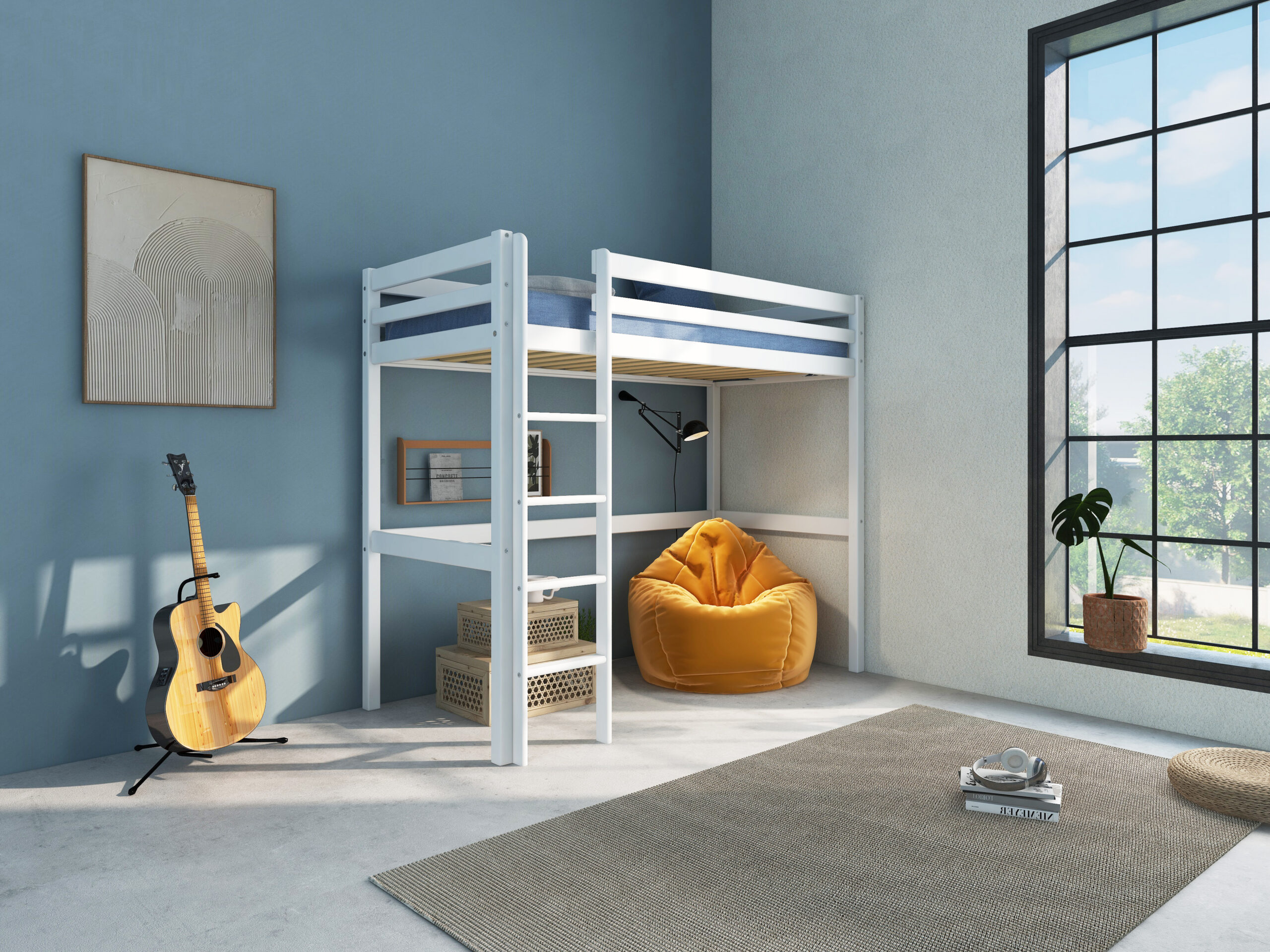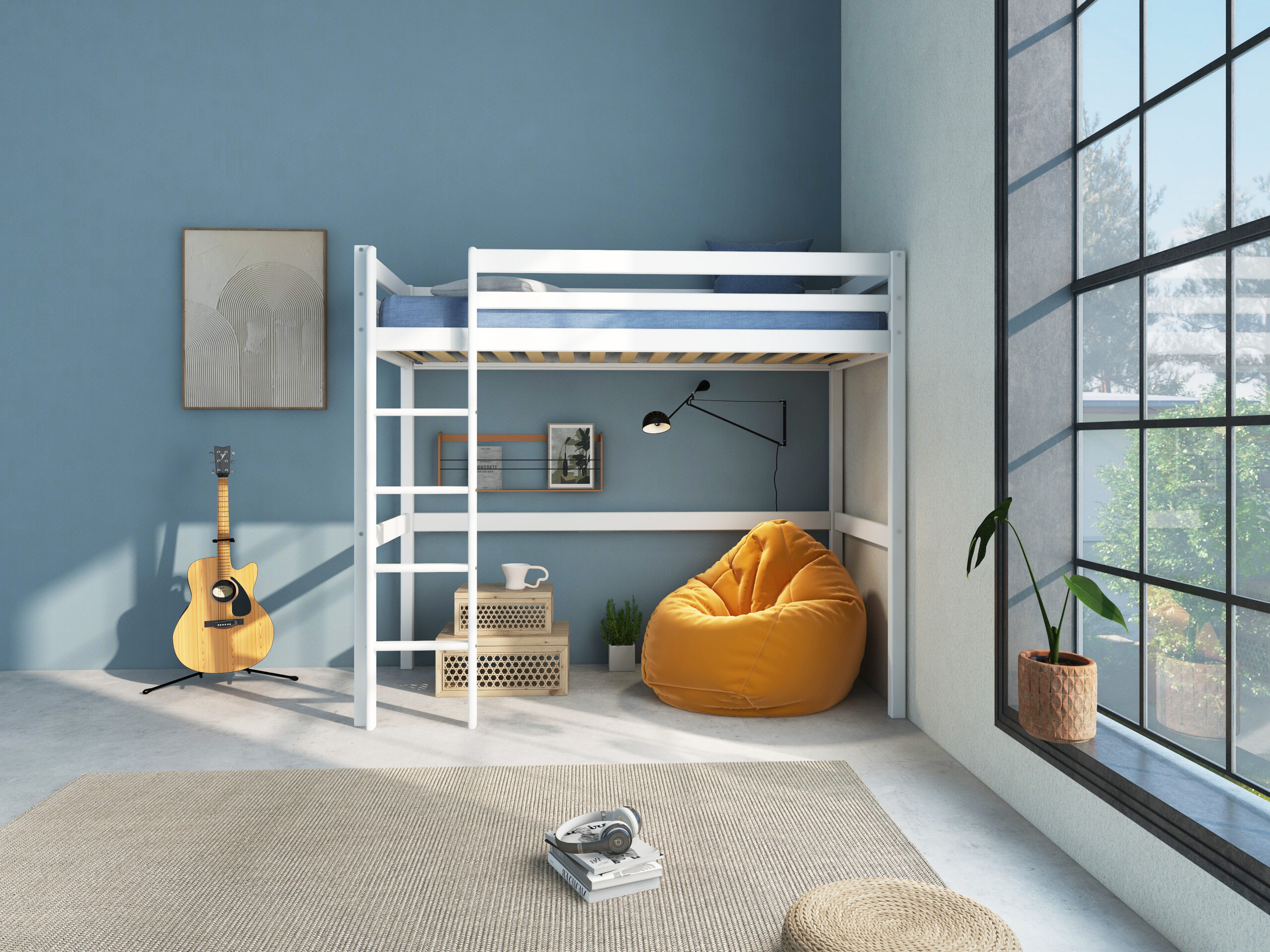 The bed is raised high so the space underneath can be used for fun, study-time or storage.
